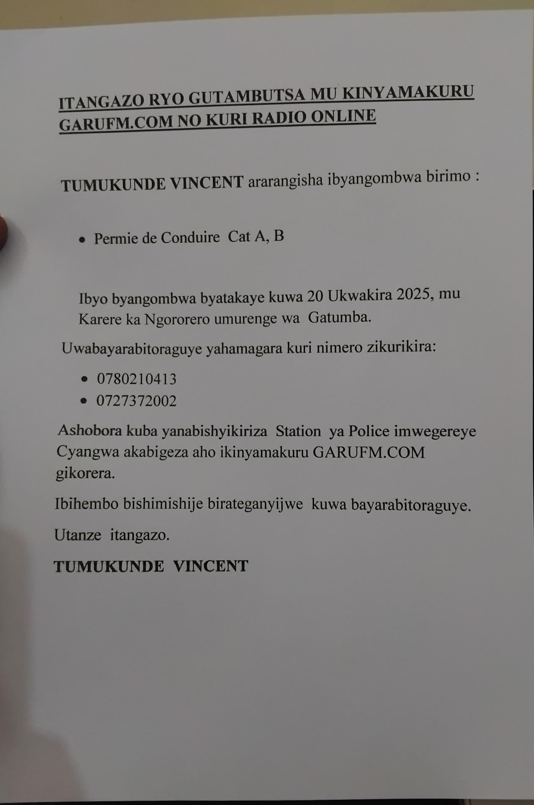 AMATANGAZO Itangazo ryo kurangisha Published 1 month ago on November 4, 2025 By ruth garu Amatangazo Share Tweet Amatangazo arangisha, amenyesha, cyamunara kuri Radio Locale Umujyi wa Muhanga. GARU FM.. Related Topics: Up Next Itangazo ryo kurangisha ibyangombwa Don't Miss Itangazo ryo kurangisha ibyangombwa ruth garu Click to comment Leave a Reply Cancel replyYour email address will not be published. Required fields are marked *Comment * Name * Email * Website Save my name, email, and website in this browser for the next time I comment. Advertisement Latest Trending Videos AMAKURU1 hour ago Impunzi 527 zivuye muri Congo ni zo zimaze kwakirwa i Rusizi News2 hours ago Tagawa wamamaye muri filime zirimo ’Mortal Kombat’ yapfuye AMATANGAZO1 day ago Itangazo ryo kurangisha ibyangombwa Tech3 months ago Spotify free gets major upgrade in 2025: you can finally pick songs MU MAHANGA4 months ago Perezida Ruto yashyize intumwa ya Kenya i Goma iri mu maboko ya AFC/M23 AMAKURU4 months ago Igisubizo cya RIB k’uwabajije ku bijyanye nabakobwa basaba guterwa inda Lifestyle5 days ago Movies that will make you cry harder than Titanic Sports1 month ago Ronaldo opens up: Arsenal love, Manchester United regrets, and life beyond fame Tanzania1 month ago Breaking: Samia Suluhu takes oath amid military and wildlife presence in Dodoma (VIDEO) Trending AMATANGAZO1 day ago Itangazo ryo kurangisha ibyangombwa
