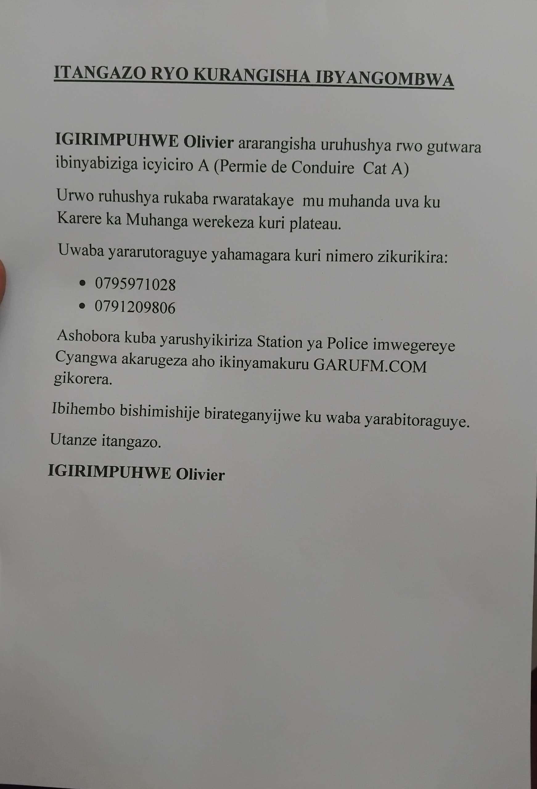 AMATANGAZO Itangazo ryo kurangisha ibyangombwa Published 1 month ago on November 5, 2025 By ruth garu Share Tweet Related Topics: Up Next Itangazo ryo kurangisha ibyangombwa Don't Miss Itangazo ryo kurangisha ruth garu Click to comment Leave a Reply Cancel replyYour email address will not be published. Required fields are marked *Comment * Name * Email * Website Save my name, email, and website in this browser for the next time I comment. Advertisement Latest Trending Videos AMAKURU1 hour ago Impunzi 527 zivuye muri Congo ni zo zimaze kwakirwa i Rusizi News2 hours ago Tagawa wamamaye muri filime zirimo ’Mortal Kombat’ yapfuye AMATANGAZO1 day ago Itangazo ryo kurangisha ibyangombwa Tech3 months ago Spotify free gets major upgrade in 2025: you can finally pick songs MU MAHANGA4 months ago Perezida Ruto yashyize intumwa ya Kenya i Goma iri mu maboko ya AFC/M23 AMAKURU4 months ago Igisubizo cya RIB k’uwabajije ku bijyanye nabakobwa basaba guterwa inda Lifestyle5 days ago Movies that will make you cry harder than Titanic Sports1 month ago Ronaldo opens up: Arsenal love, Manchester United regrets, and life beyond fame Tanzania1 month ago Breaking: Samia Suluhu takes oath amid military and wildlife presence in Dodoma (VIDEO) Trending AMATANGAZO1 day ago Itangazo ryo kurangisha ibyangombwa