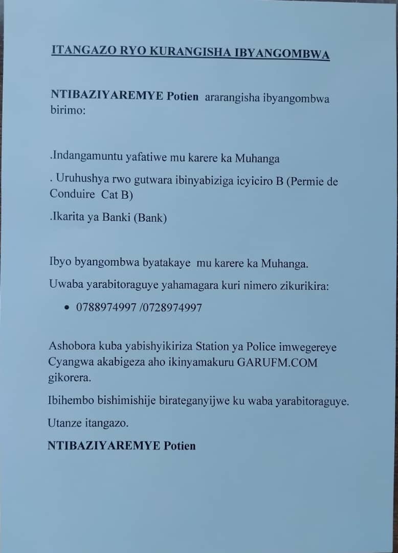 Amatangazo arangisha, amenyesha, cyamunara kuri Radio Locale Umujyi wa Muhanga. GARU FM..