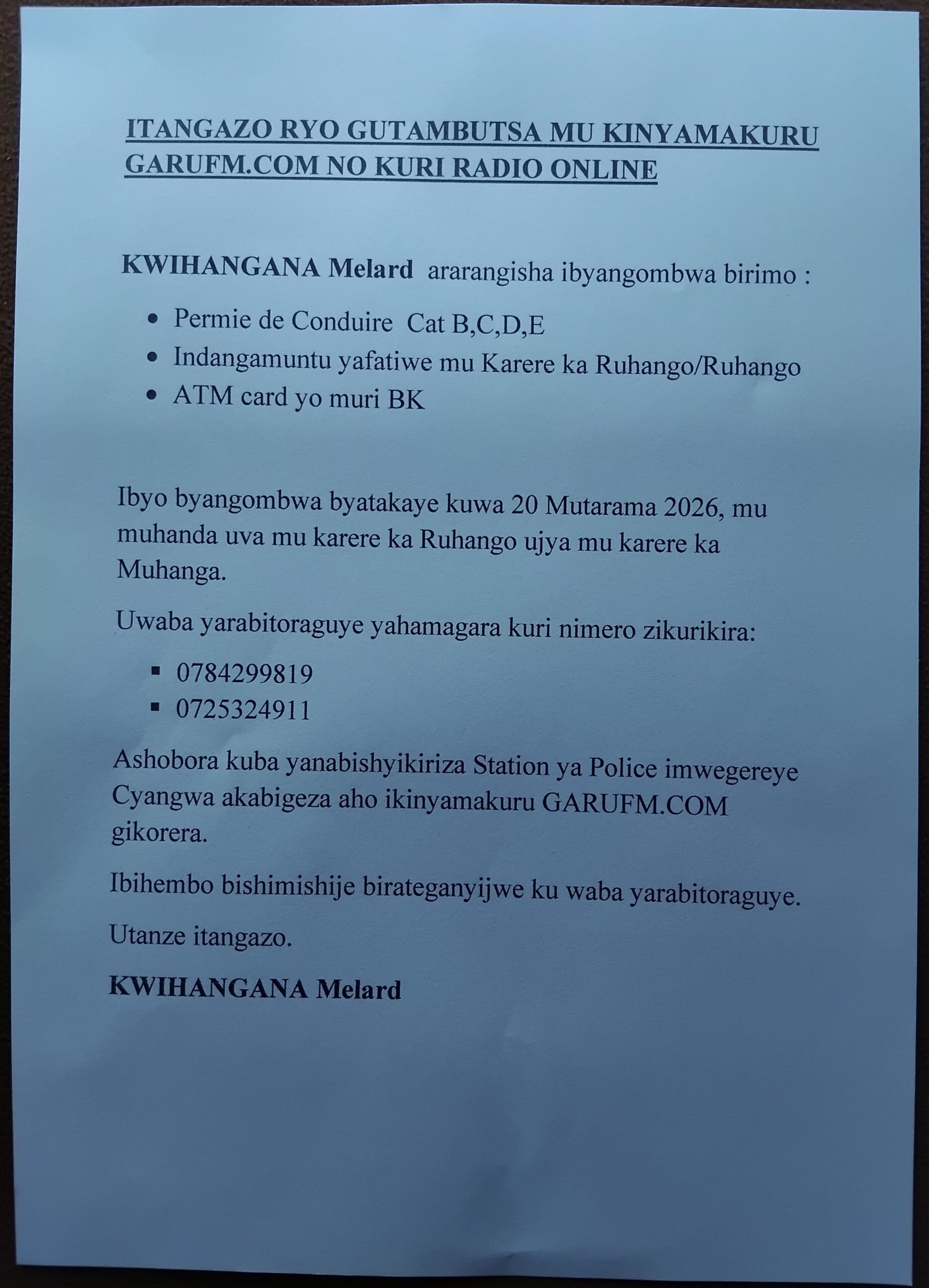 AMATANGAZO Itangazo ryo kurangisha ibyangombwa Published 1 hour ago on January 29, 2026 By ruth garu Share Tweet Related Topics: Don't Miss Itangazo ryo kurangisha ruth garu Click to comment Leave a Reply Cancel replyYour email address will not be published. Required fields are marked *Comment * Name * Email * Website Save my name, email, and website in this browser for the next time I comment. Advertisement Latest Trending Videos AMATANGAZO1 hour ago Itangazo ryo kurangisha ibyangombwa AMAKURU1 week ago “Ubuhuza bwa Togo nibwo shingiro” Afurika Yunze ubumwe ku makimbirane yo mu Burasirazuba bwa Congo AMATANGAZO3 weeks ago Itangazo ryo kurangisha Tech4 months ago Spotify free gets major upgrade in 2025: you can finally pick songs MU MAHANGA6 months ago Perezida Ruto yashyize intumwa ya Kenya i Goma iri mu maboko ya AFC/M23 AMAKURU6 months ago Igisubizo cya RIB k’uwabajije ku bijyanye nabakobwa basaba guterwa inda AMAKURU1 month ago Rubavu hatashywe inyubako yubatswe n’abagore bahoze mu bucuruzi butemewe Lifestyle2 months ago Movies that will make you cry harder than Titanic Sports3 months ago Ronaldo opens up: Arsenal love, Manchester United regrets, and life beyond fame Trending