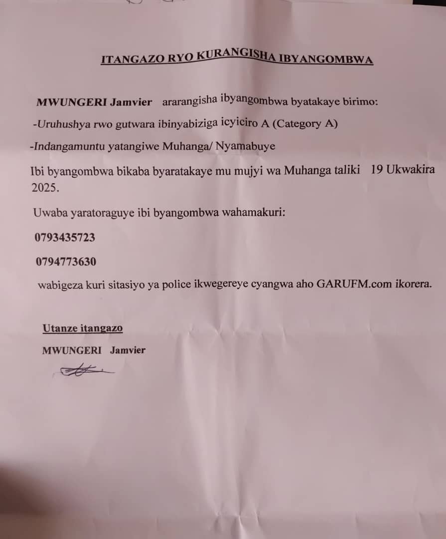 AMATANGAZO Itangazo ryo kurangisha ibyangombwa Published 1 month ago on October 28, 2025 By ruth garu Amatangazo Share Tweet Amatangazo arangisha, amenyesha, cyamunara kuri Radio Locale Umujyi wa Muhanga. GARU FM.. Advertisement Related Topics: Up Next Itangazo ryo kurangisha Don't Miss Itangazo ryo kurangisha ruth garu Click to comment Leave a Reply Cancel replyYour email address will not be published. Required fields are marked *Comment * Name * Email * Website Save my name, email, and website in this browser for the next time I comment. Advertisement Latest Trending Videos AMAKURU1 hour ago Impunzi 527 zivuye muri Congo ni zo zimaze kwakirwa i Rusizi News2 hours ago Tagawa wamamaye muri filime zirimo ’Mortal Kombat’ yapfuye AMATANGAZO1 day ago Itangazo ryo kurangisha ibyangombwa Tech3 months ago Spotify free gets major upgrade in 2025: you can finally pick songs MU MAHANGA4 months ago Perezida Ruto yashyize intumwa ya Kenya i Goma iri mu maboko ya AFC/M23 AMAKURU4 months ago Igisubizo cya RIB k’uwabajije ku bijyanye nabakobwa basaba guterwa inda Lifestyle5 days ago Movies that will make you cry harder than Titanic Sports1 month ago Ronaldo opens up: Arsenal love, Manchester United regrets, and life beyond fame Tanzania1 month ago Breaking: Samia Suluhu takes oath amid military and wildlife presence in Dodoma (VIDEO) Trending AMATANGAZO1 day ago Itangazo ryo kurangisha ibyangombwa